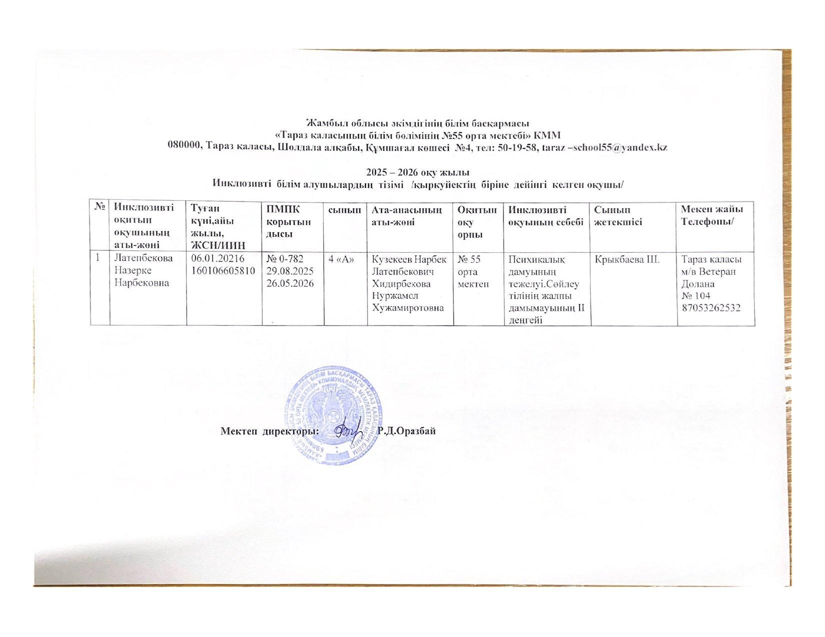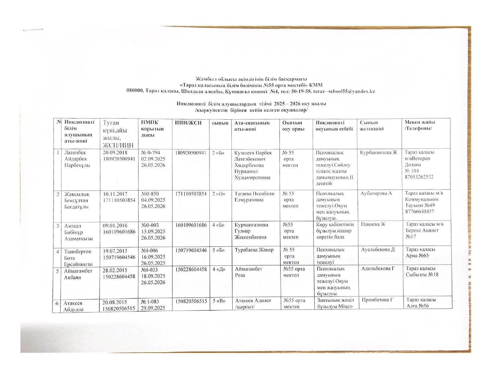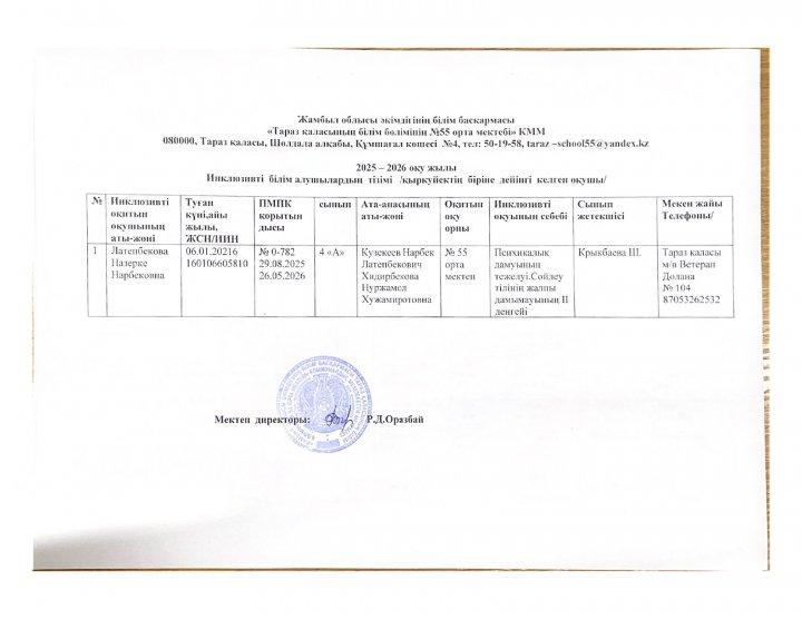 2025-2026 оқу жылы Инклюзивті білім алушылардың тізімі » СШ №55