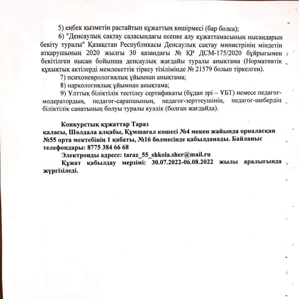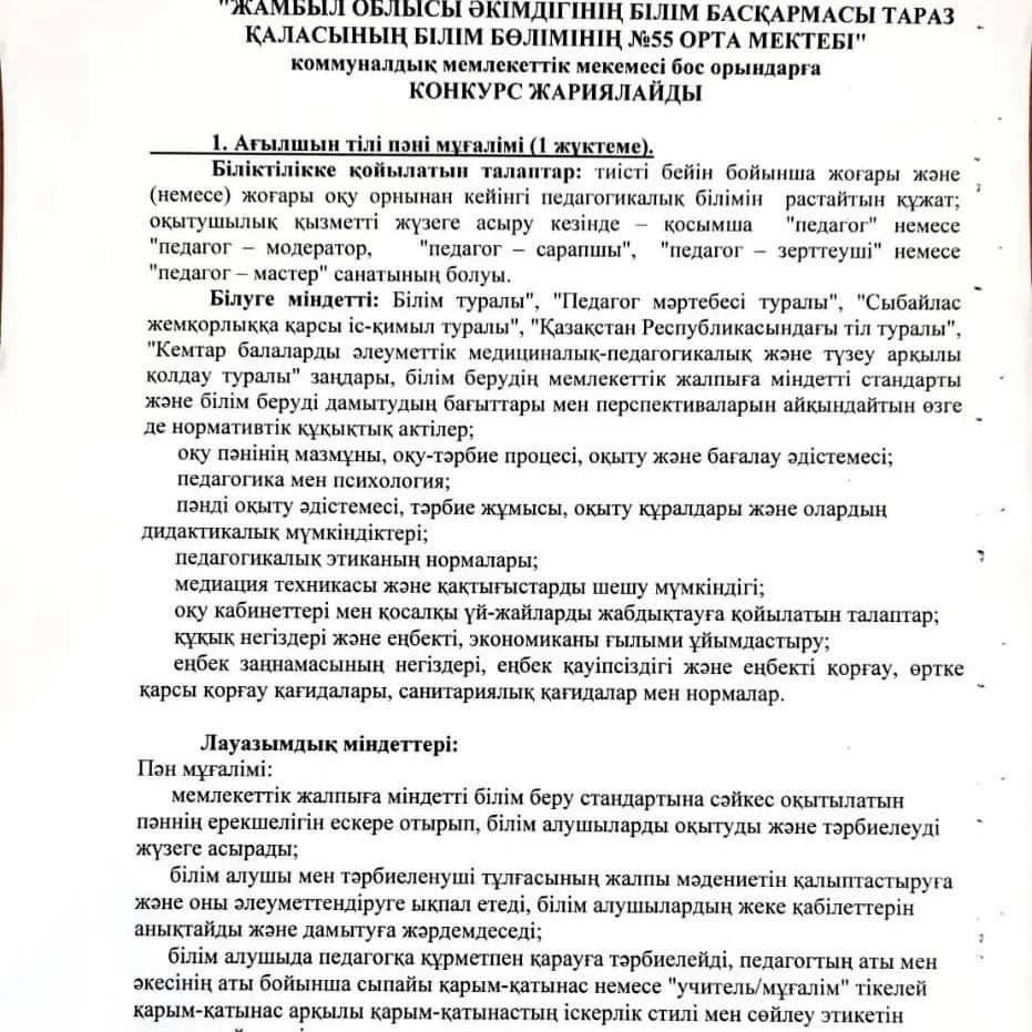 30 июль 2022 0 1 2 3 4 5 Хабарландыру . Жамбыл облысы әкімдігінің білім басқармасы Тараз қаласының білім бөлімінің №55 орта мектебі КММ бос орындарға КОНКУРС жариялайды