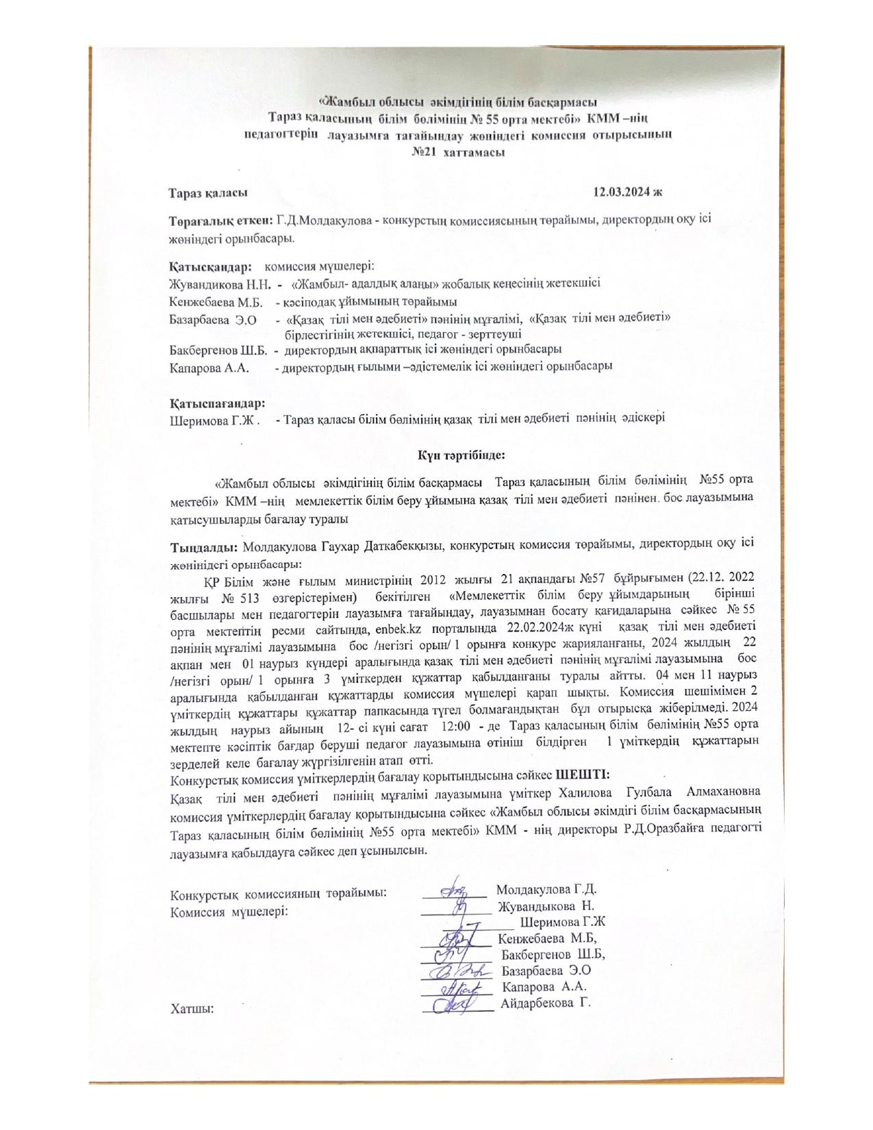 12 март 2024 0 1 2 3 4 5 Қазақ тілі мен әдебиеті пәнінің бойынша бос лауазым конкурсының нәтижесінінің хаттамасы Конкурстық комиссия үміткердің бағалау қорытындысына сәйкес қазақ тілі мен әдебиеті пәнінің лауазымына Халилова Гүлбала бос лауазымға сәйкес деп таныды