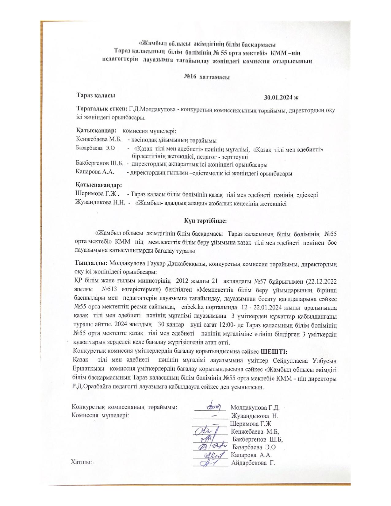 30 январь 2024 0 1 2 3 4 5 Қазақ тілі мен әдебиеті пәнінің бойынша бос лауазым конкурсының нәтижесінінің хаттамасы Конкурстық комиссия үміткердің бағалау қорытындысына сәйкес қазақ тілі мен әдебиеті пәнінің лауазымына Сейдуалиева Ұлбосын бос лауазымға сәйкес деп таныды