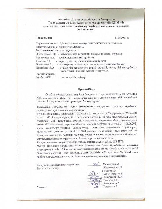 17 сентябрь 2024 0 1 2 3 4 5 Педагог-психолог бойынша бос лауазым конкурсының нәтижесінінің хаттамасы Конкурстық комиссия үміткердің бағалау қорытындысына сәйкес педагог-психолог лауазымына Тажимуратова Злиха бос лауазымға сәйкес деп таныды