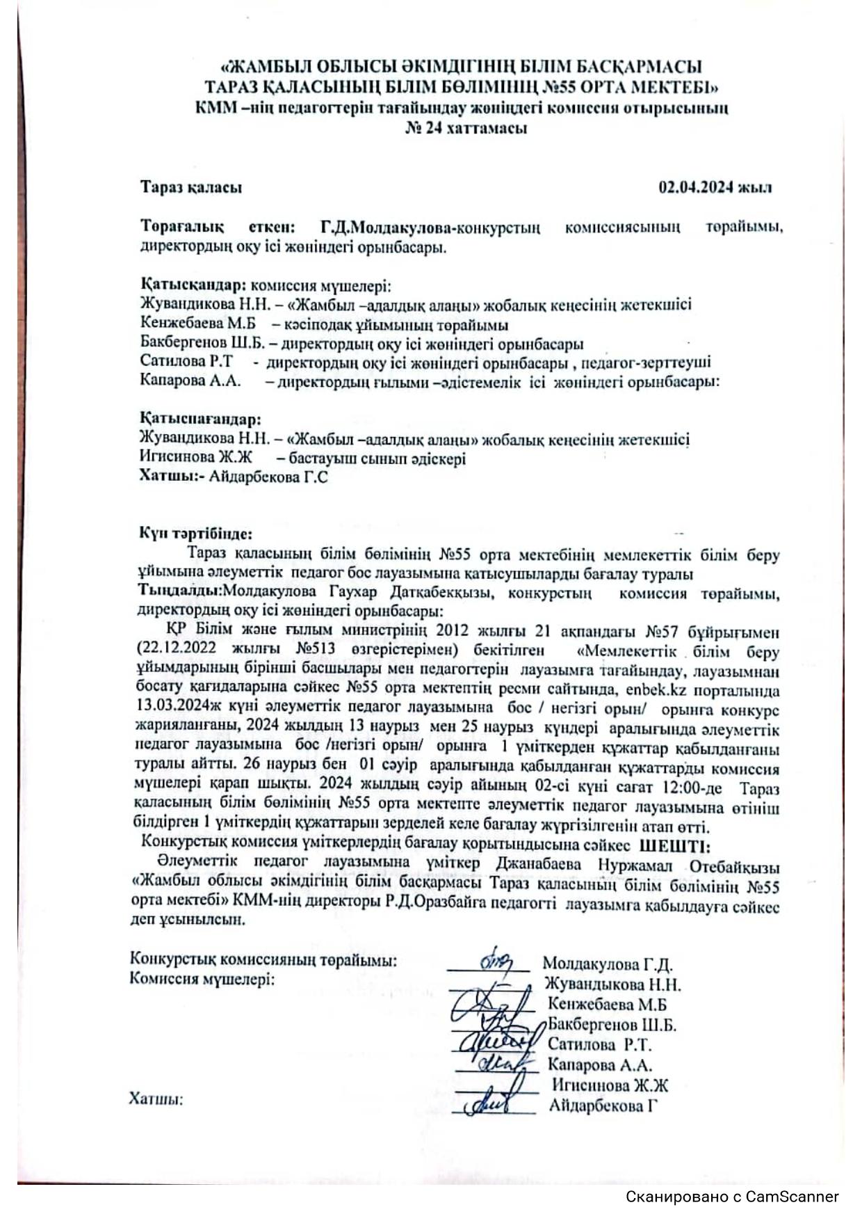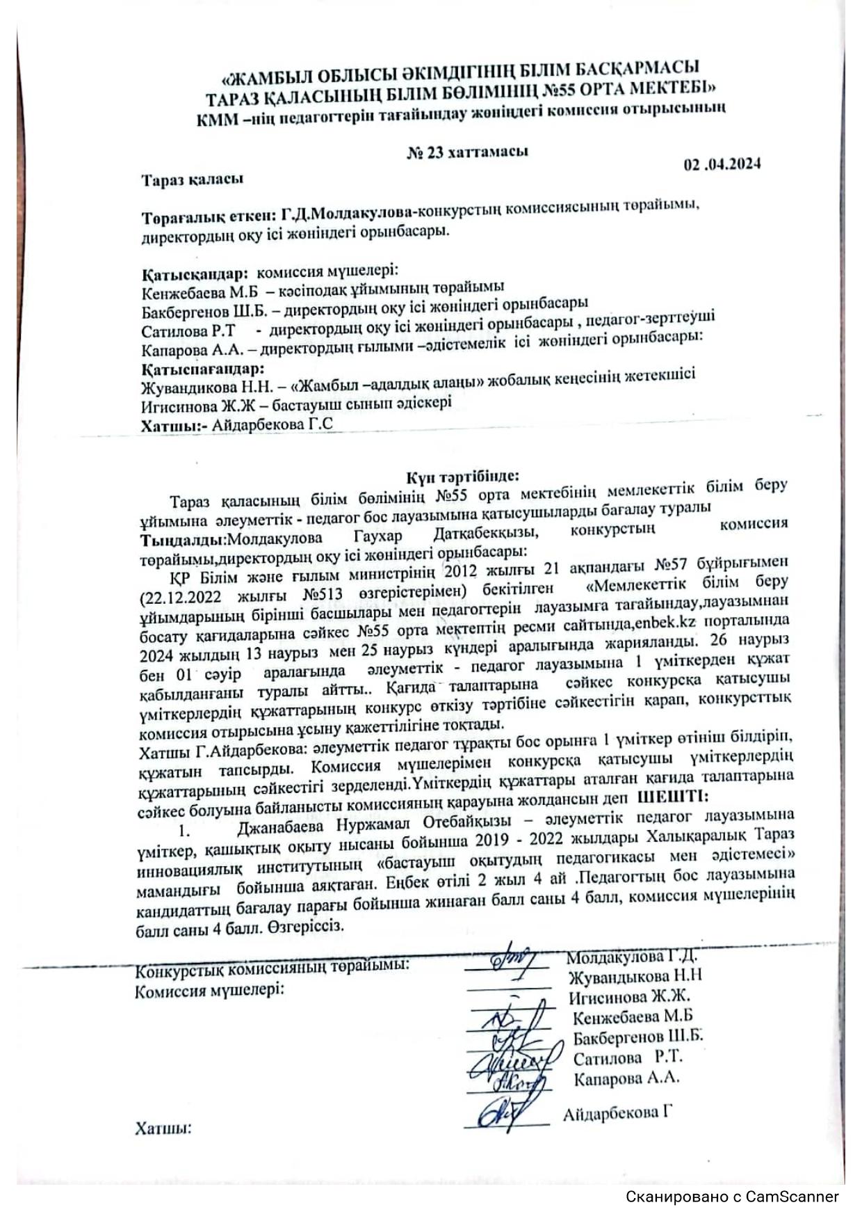 02 апрель 2024 0 1 2 3 4 5 Әлеуметтік педагог бойынша бос лауазым конкурсының нәтижесінінің хаттамасы Конкурстық комиссия үміткердің бағалау қорытындысына сәйкес әлеуметтік педагог лауазымына Джанабаева Нуржамал бос лауазымға сәйкес деп таныды