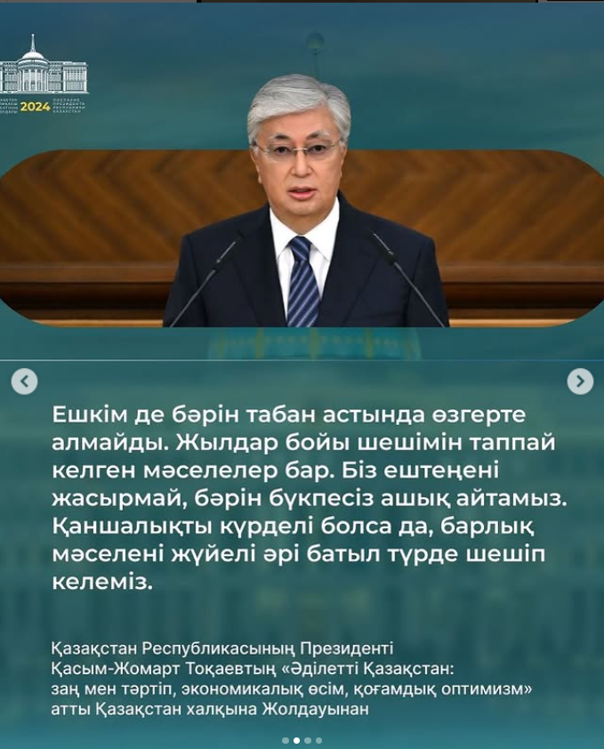 17 сентябрь 2024 0 1 2 3 4 5 Қазақстан Республикасынының Президенті Қасым-Жомарт Тоқаевтың атты Қазақстан халқына Жолдауынан