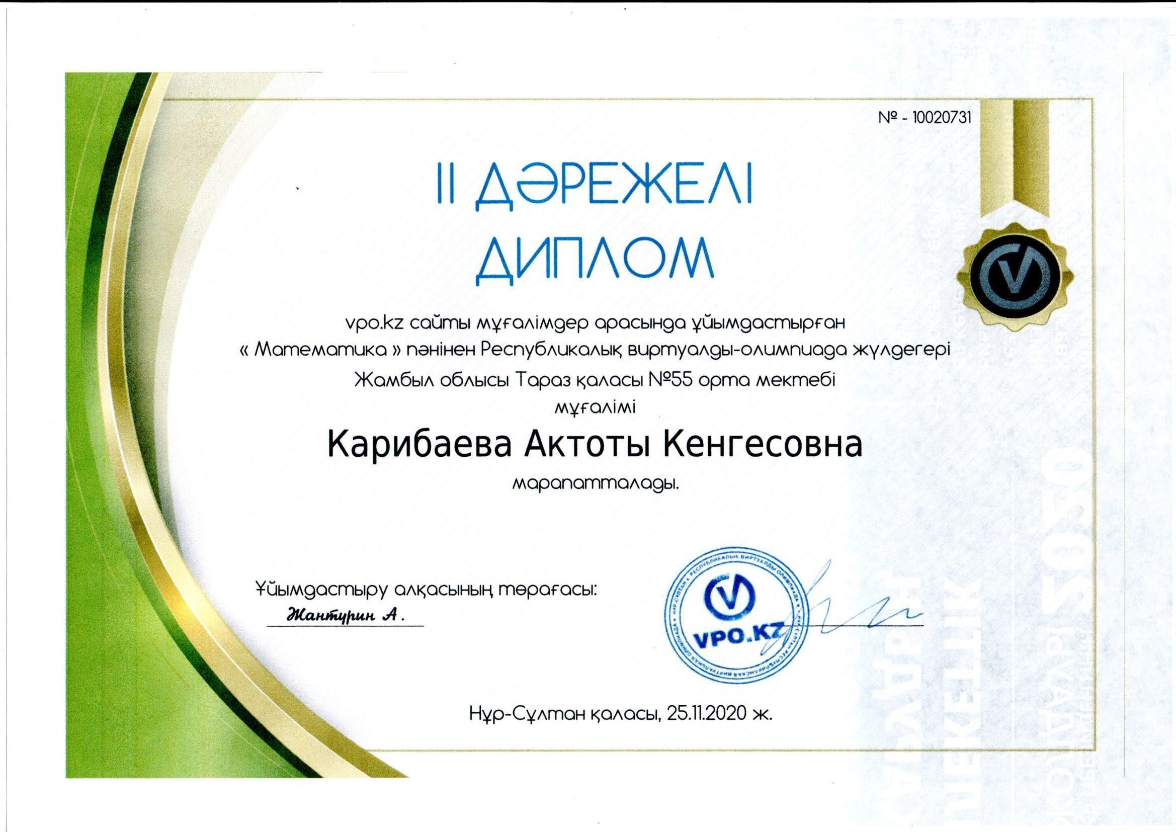 26 ноябрь 2020 0 1 2 3 4 5 Республикалық математика пәнінен ұстаздар арасында олимпиада жеңімпазы №55 орта мектебінің мұғалімі Карибаевва Ақтоты