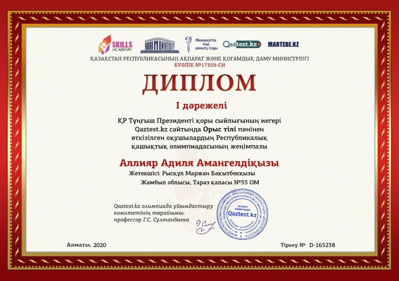 Алилияр Адиля Qaztest. сатйында орыс тілі пәнінің олимпиада жүлдегері
