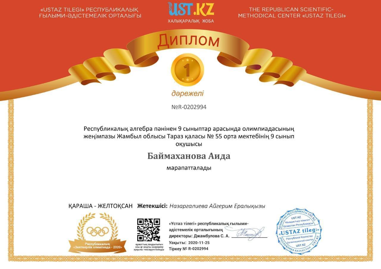 26 ноябрь 2020 0 1 2 3 4 5 Республикалық алгебра пәніен 9 сыныпар арасында 1-ші дәрежелі диплом Баймахнова Аида марапатталады