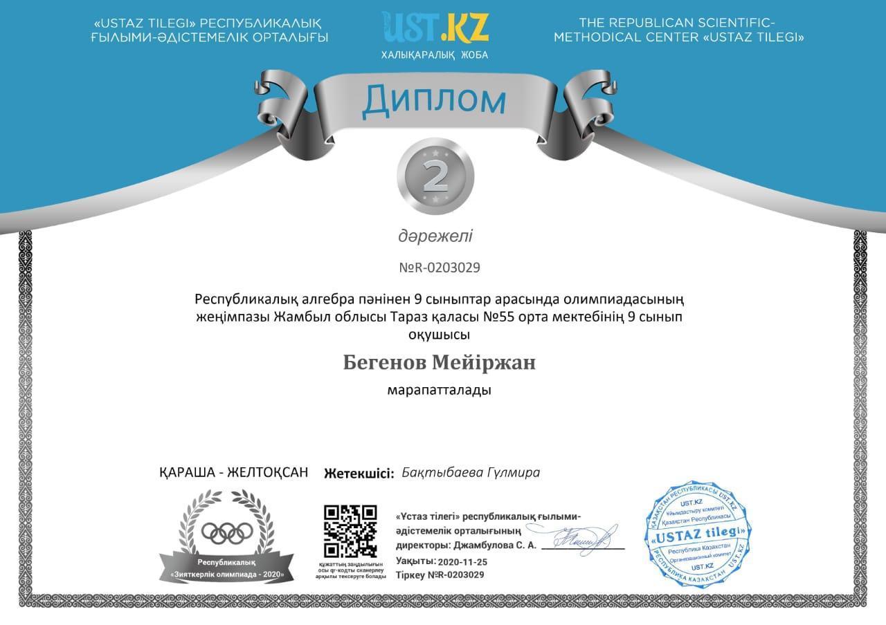 26 ноябрь 2020 0 1 2 3 4 5 Республикалық алгебра пәніен олимпиада 9 сыныпар арасында 2-ші дәрежелі диплом Бегенов Мейіржан марапатталады