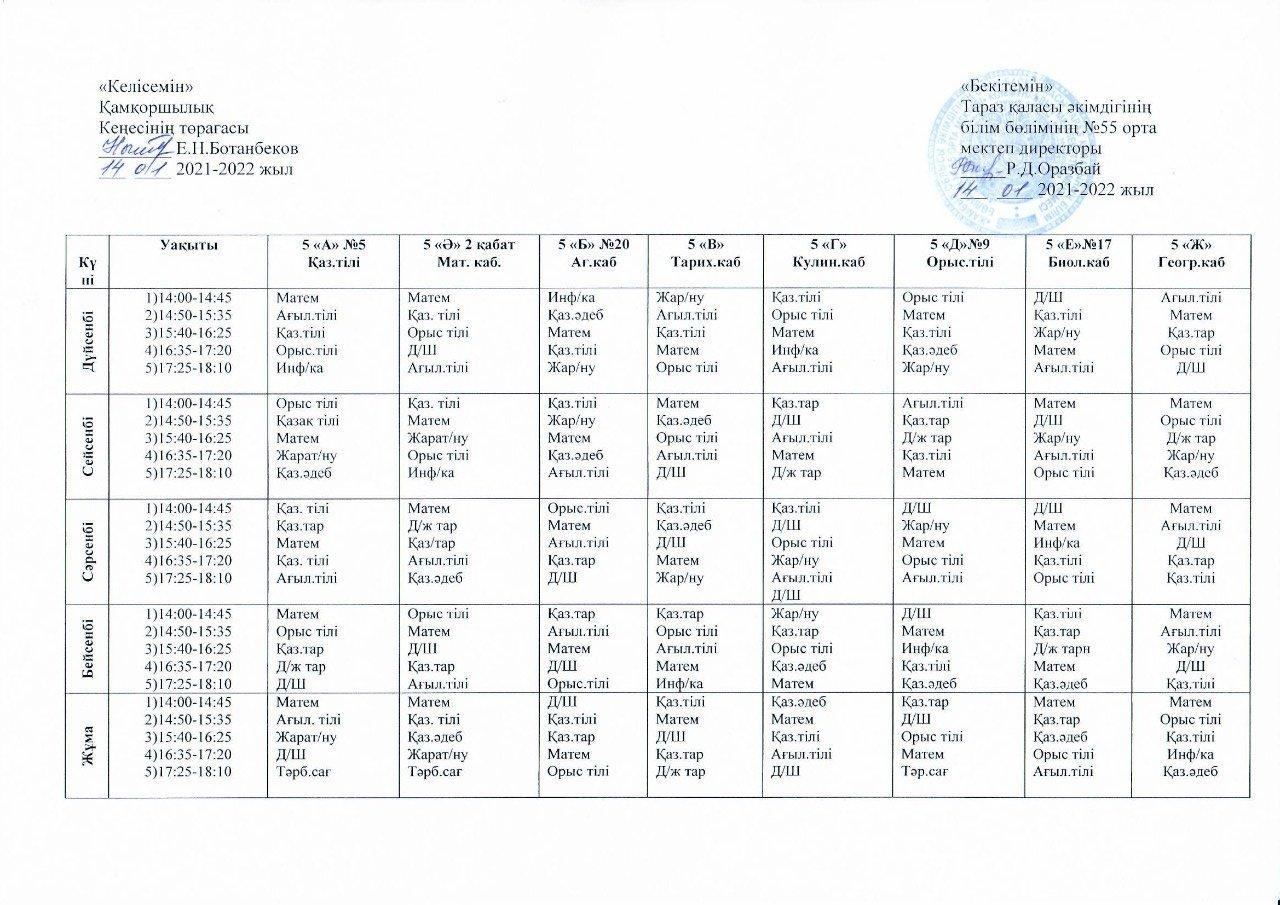 2021-2022 оқу жылындағы 5-6-7 сыныптарының 2 жарты жылдық сабақ кестесі » СШ №55