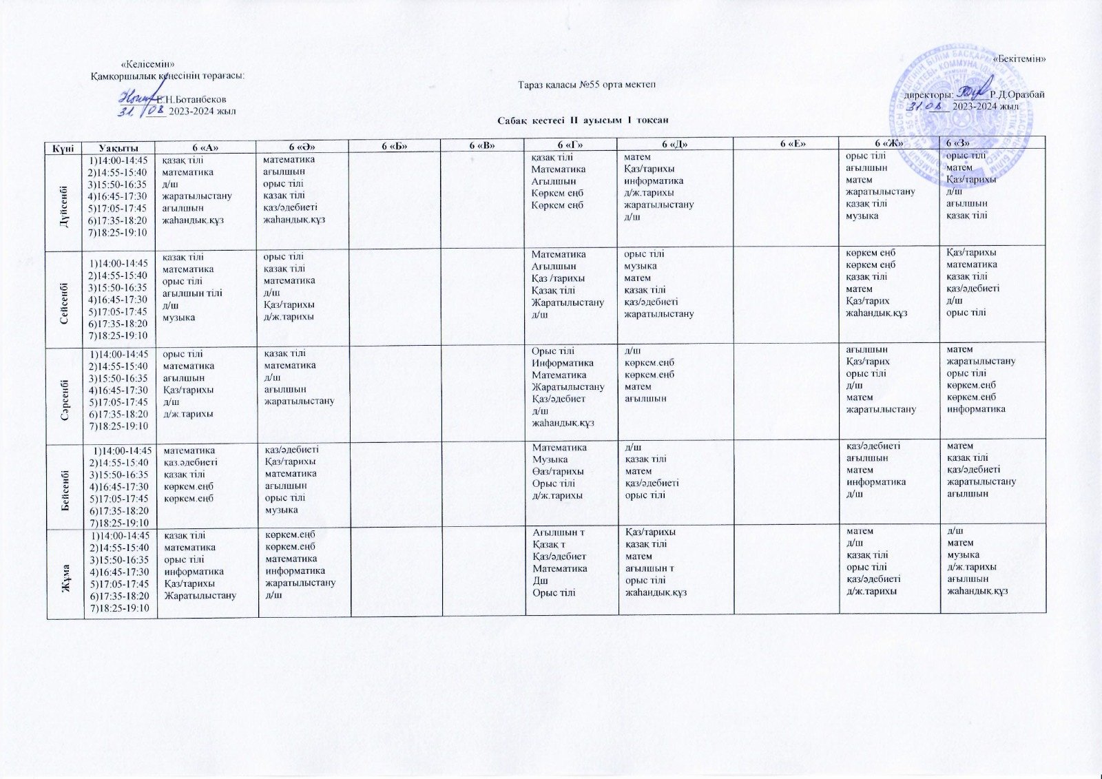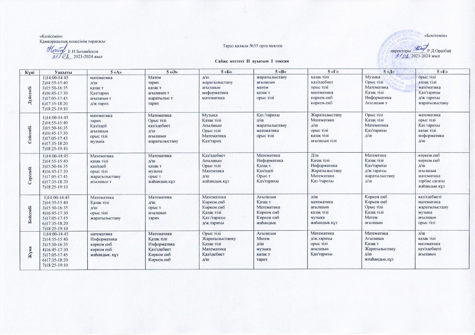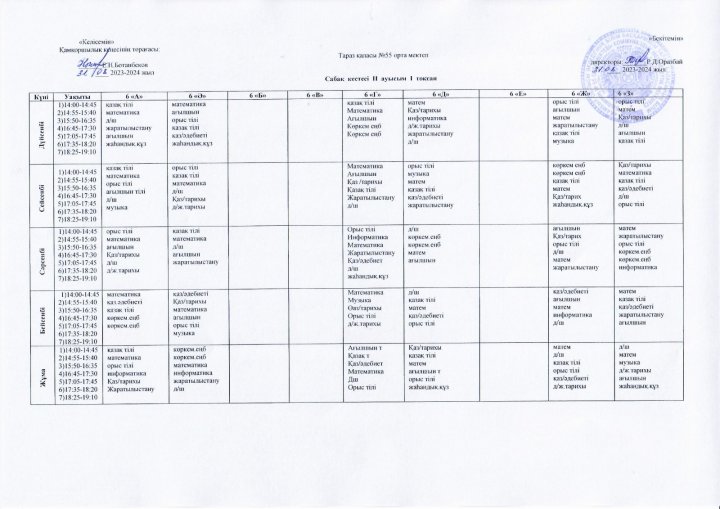 2023-2024 оқу жылындағы ІІ ауысым сыныптарының 1 тоқсан сабақ кестесі » СШ №55