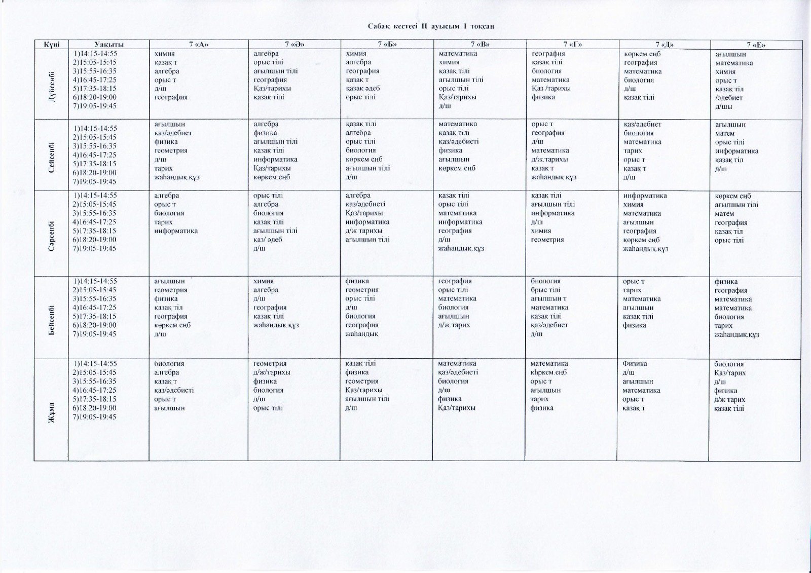 2023-2024 оқу жылындағы ІІ ауысым сыныптарының 1 тоқсан сабақ кестесі