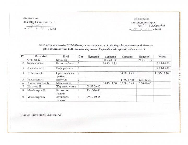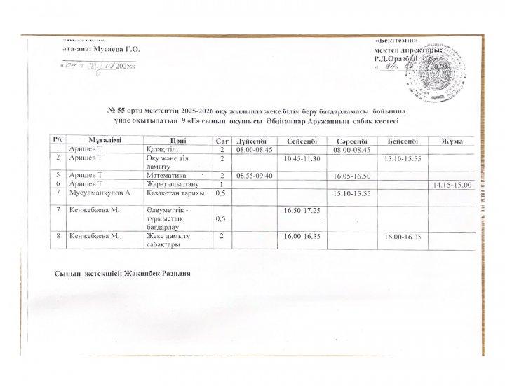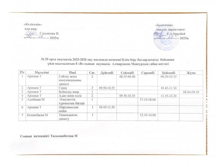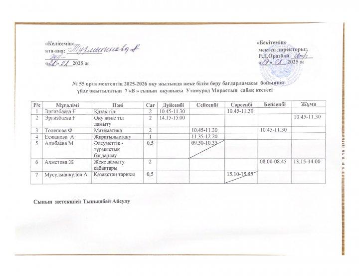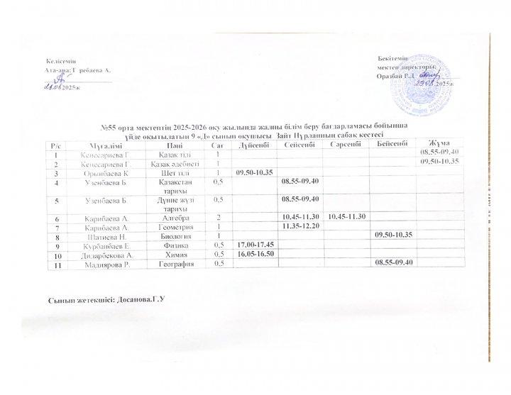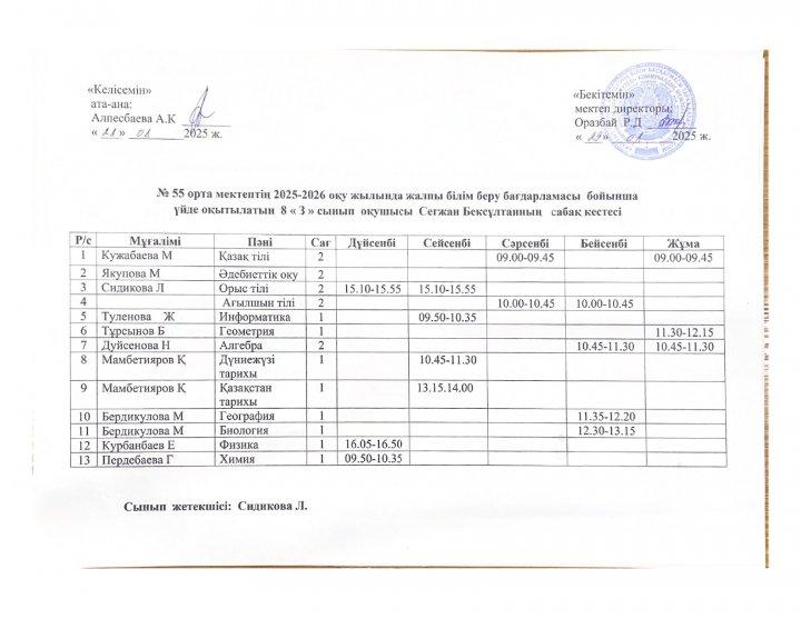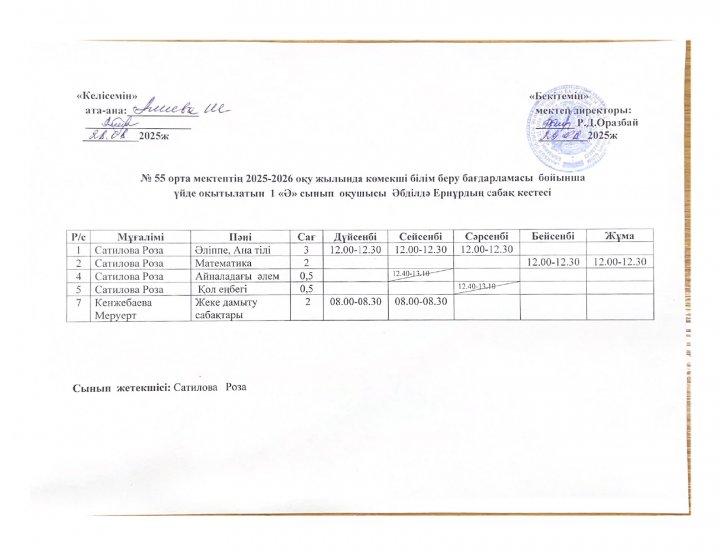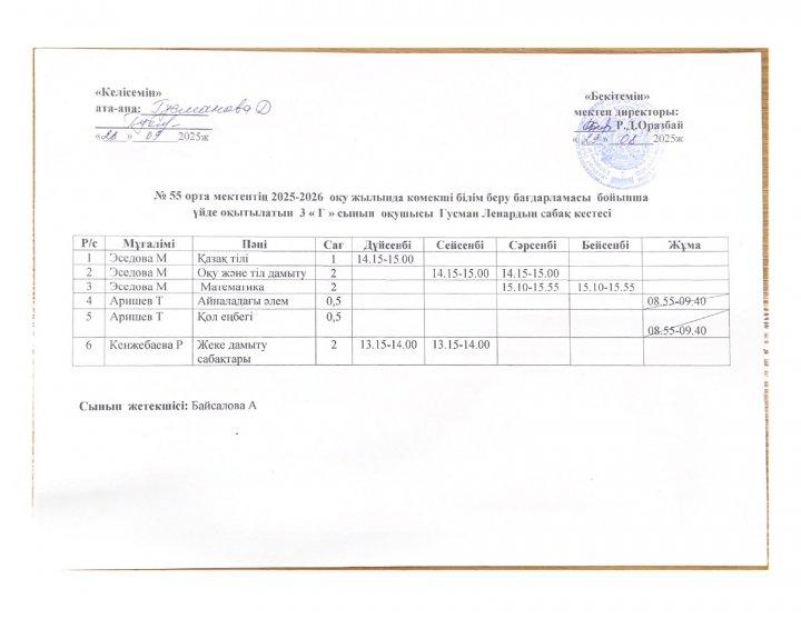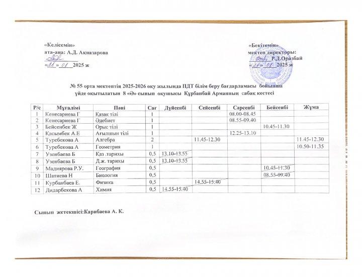 02 октябрь 2025 0 1 2 3 4 5 №55 орта мектебінің 2025-2026 оқу жылында ПДТ білім беру бағдарламасы бойынша үйде оқытылатын оқушылардың сабақ кестесі