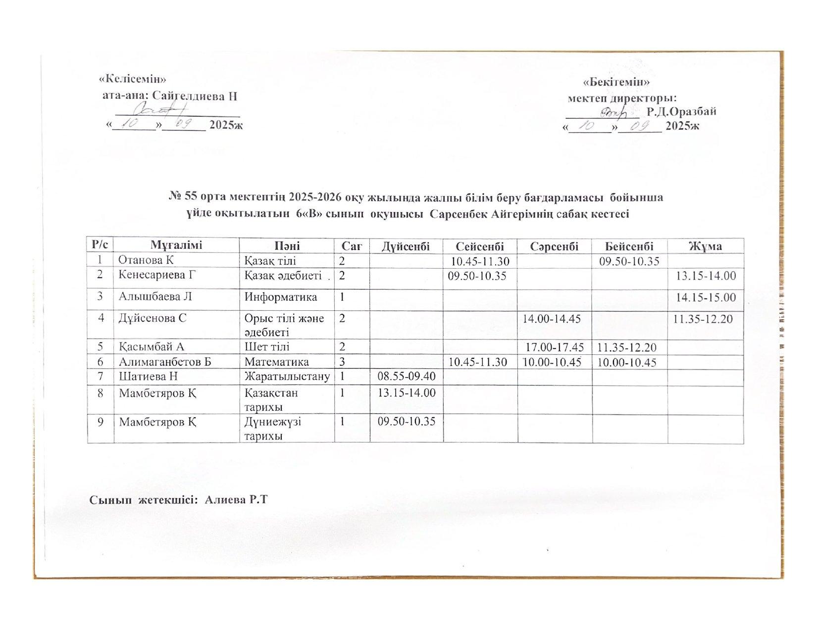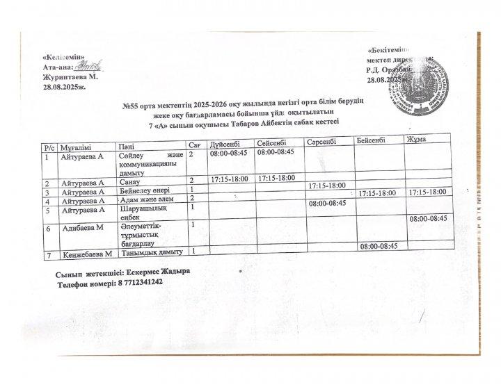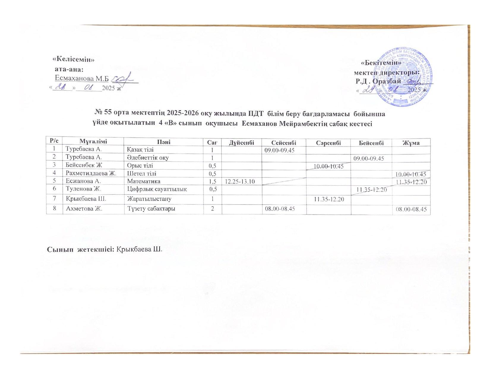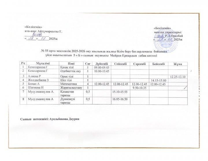 02 октябрь 2025 0 1 2 3 4 5 №55 орта мектебінің 2025-2026 оқу жылында ПДТ білім беру бағдарламасы бойынша үйде оқытылатын оқушылардың сабақ кестесі