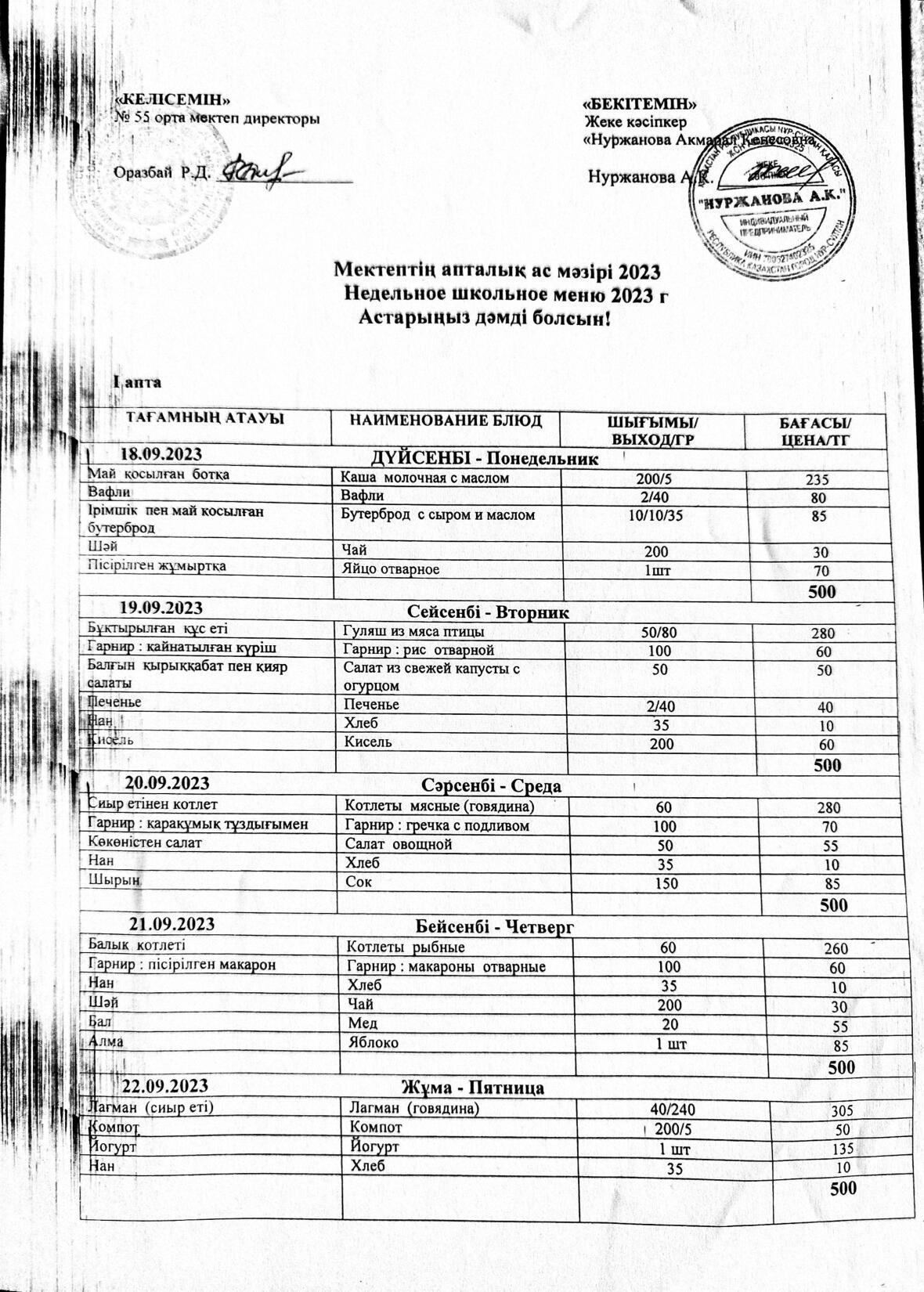Мектептің апталық ас мәзірі қыркүйек айы 3 апта » СШ №55