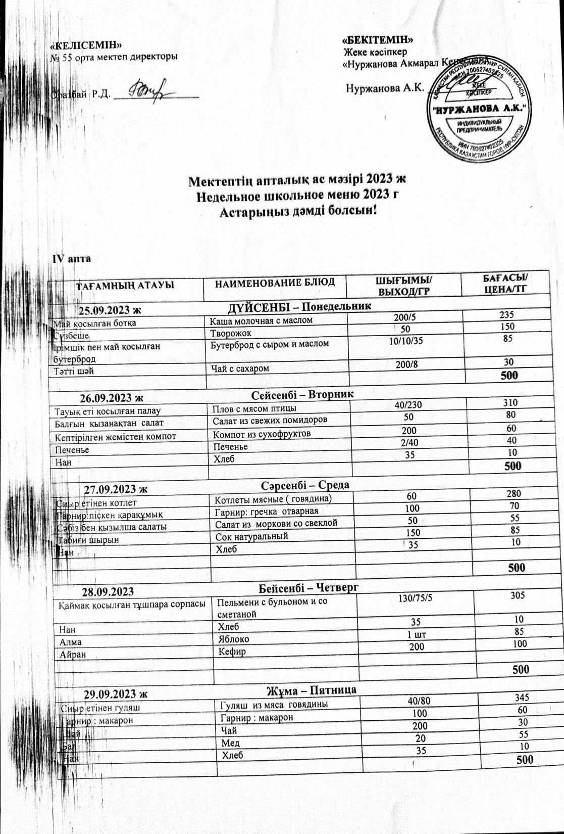 Мектептің апталық ас мәзірі қыркүйек айы 3 апта » СШ №55