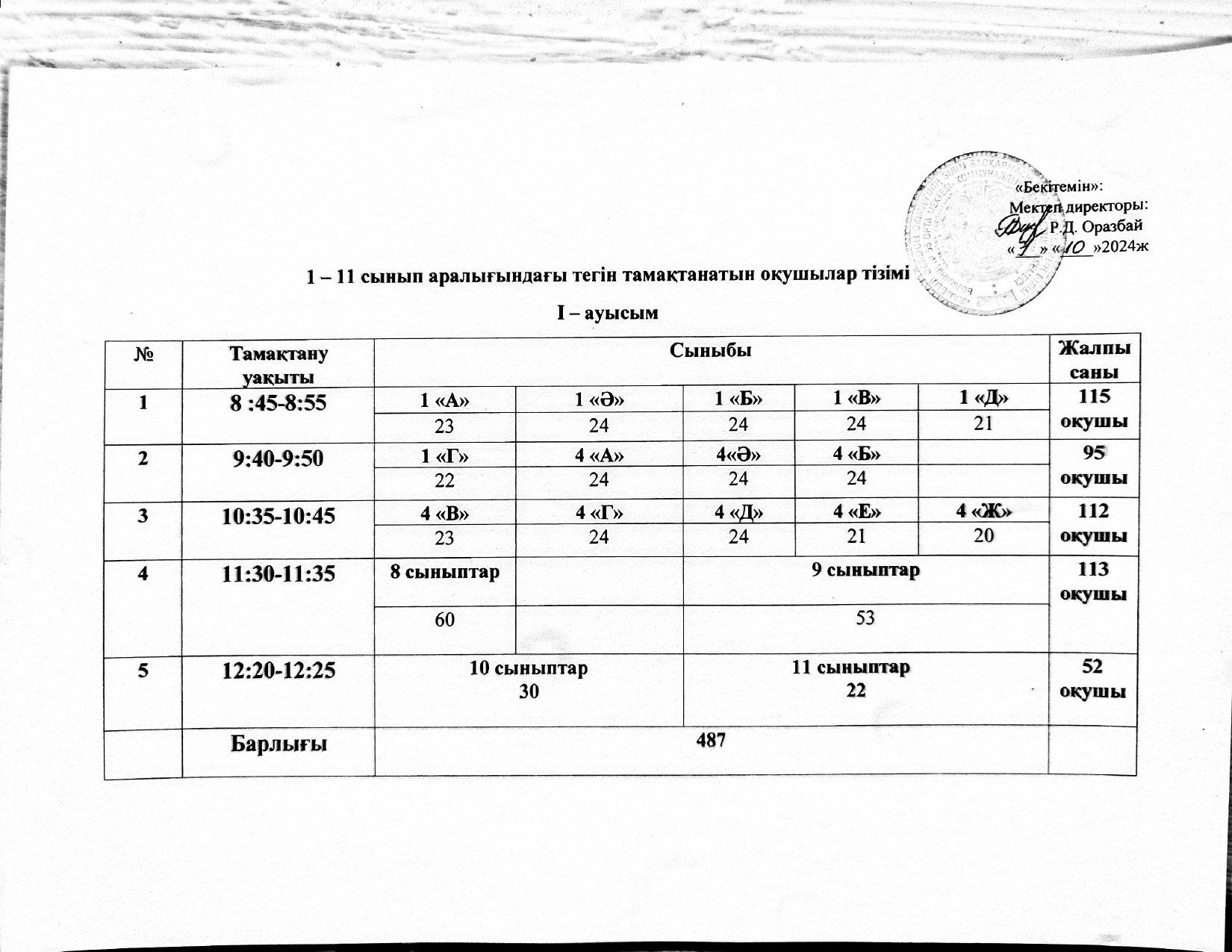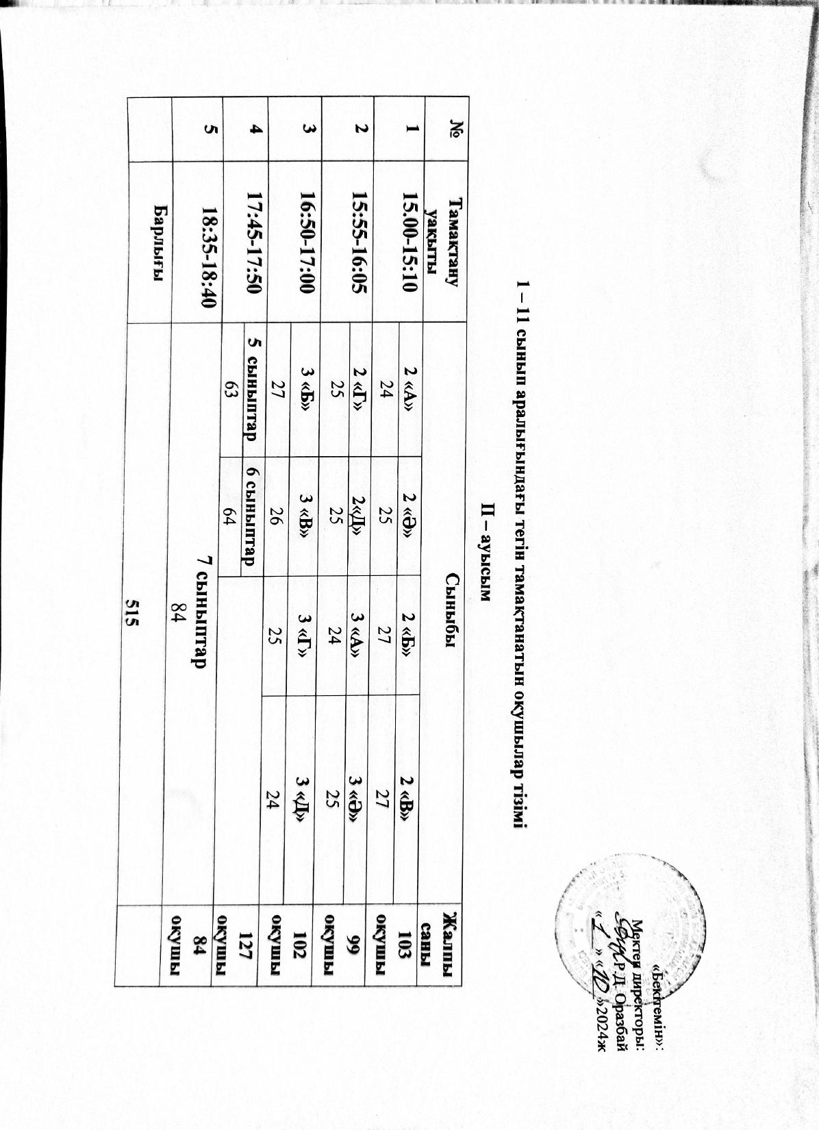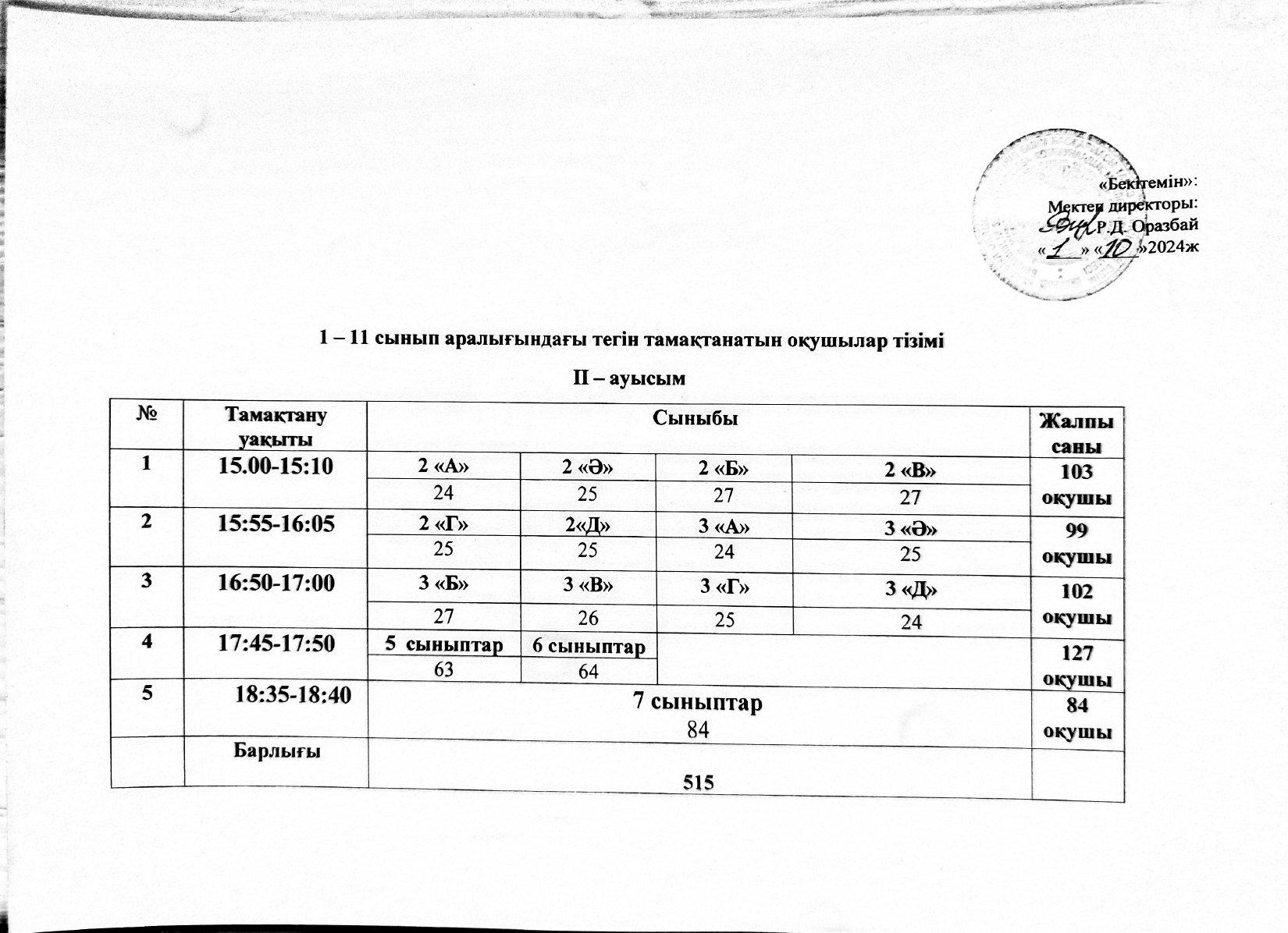 1-11 сынып оқушыларының тегін тамақтану кестесі