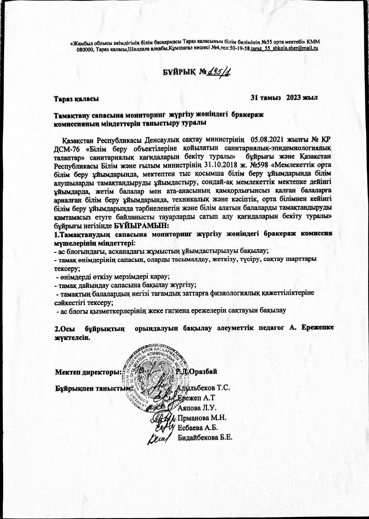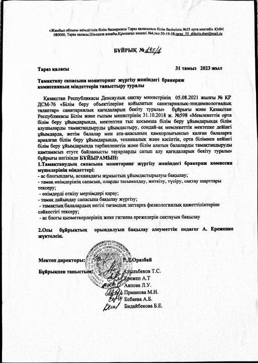 01 сентябрь 2023 0 1 2 3 4 5 Тамақтану сапасын жақсарту мақсатында бракераж комиссиясын құру туралы бұйрық