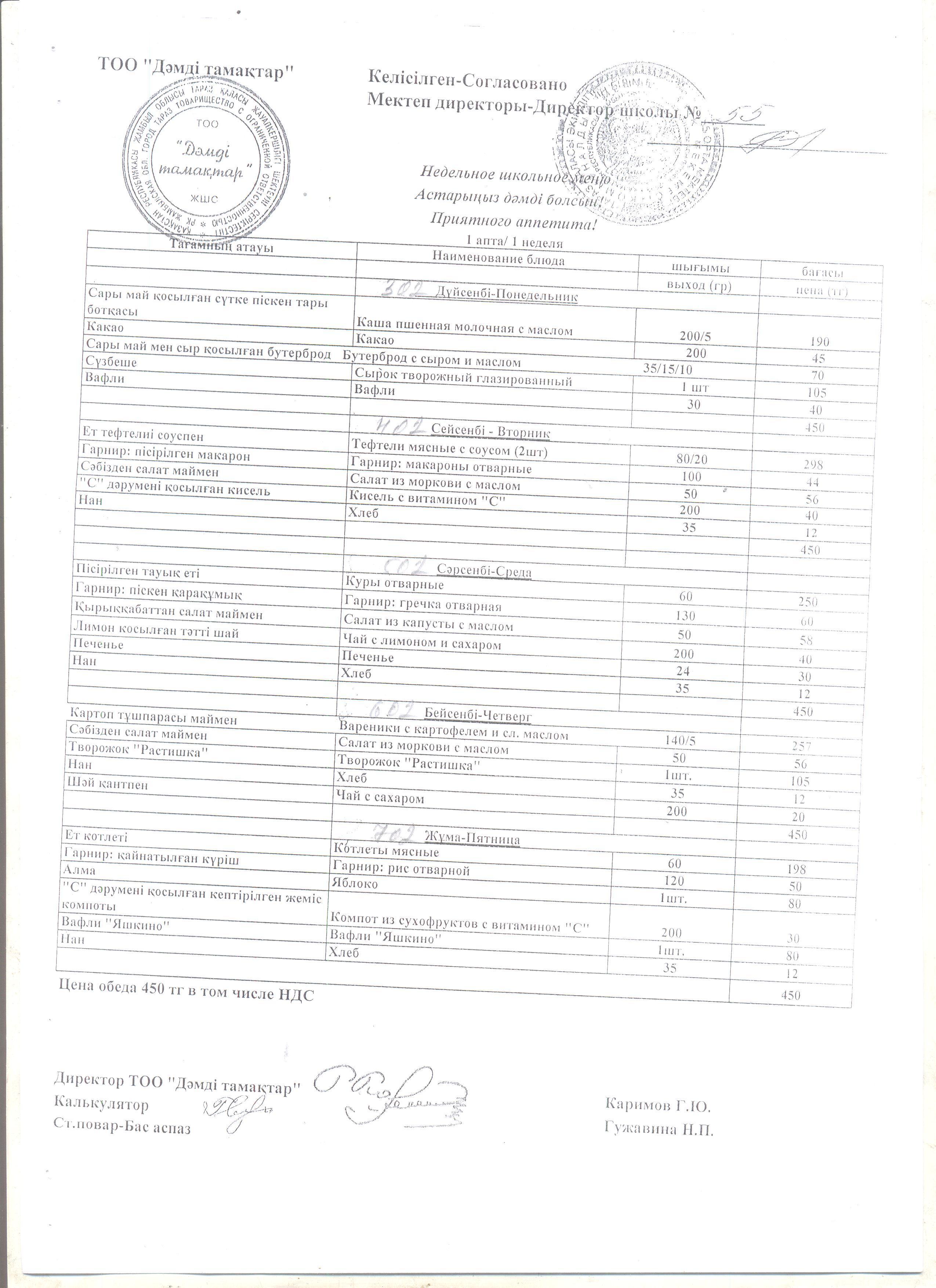 Тамақ өлшемі мен бағасы » СШ №55